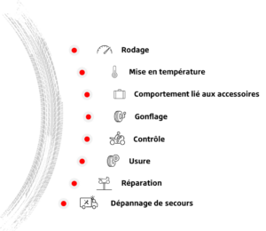 Toute réparation sur le pneumatique (démontage, montage puis d’équilibrage est l’affaire d’un professionnel. Une mauvaise opération sur le pneu peut le détériorer et mettre en jeu la sécurité du pilote.